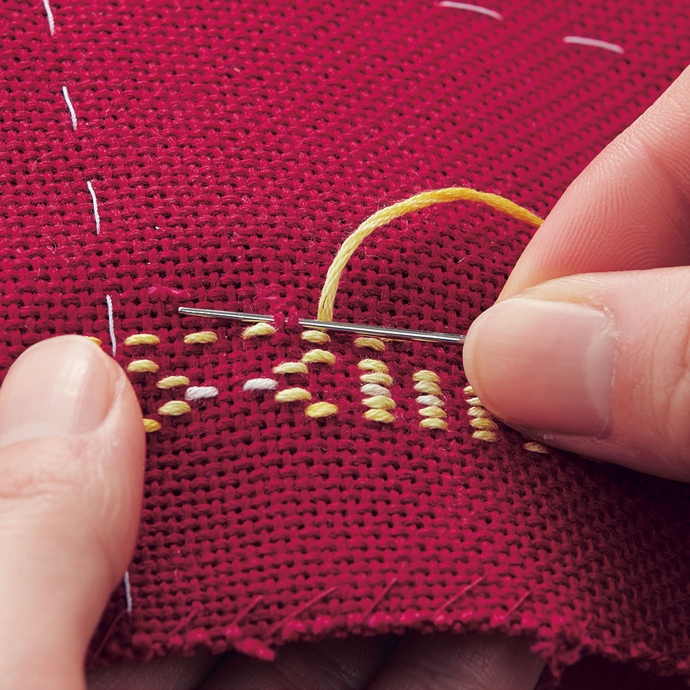 青森県津軽地方の伝統刺し子「こぎん刺し」で、北欧風の布小物作りが楽しめるキットです。