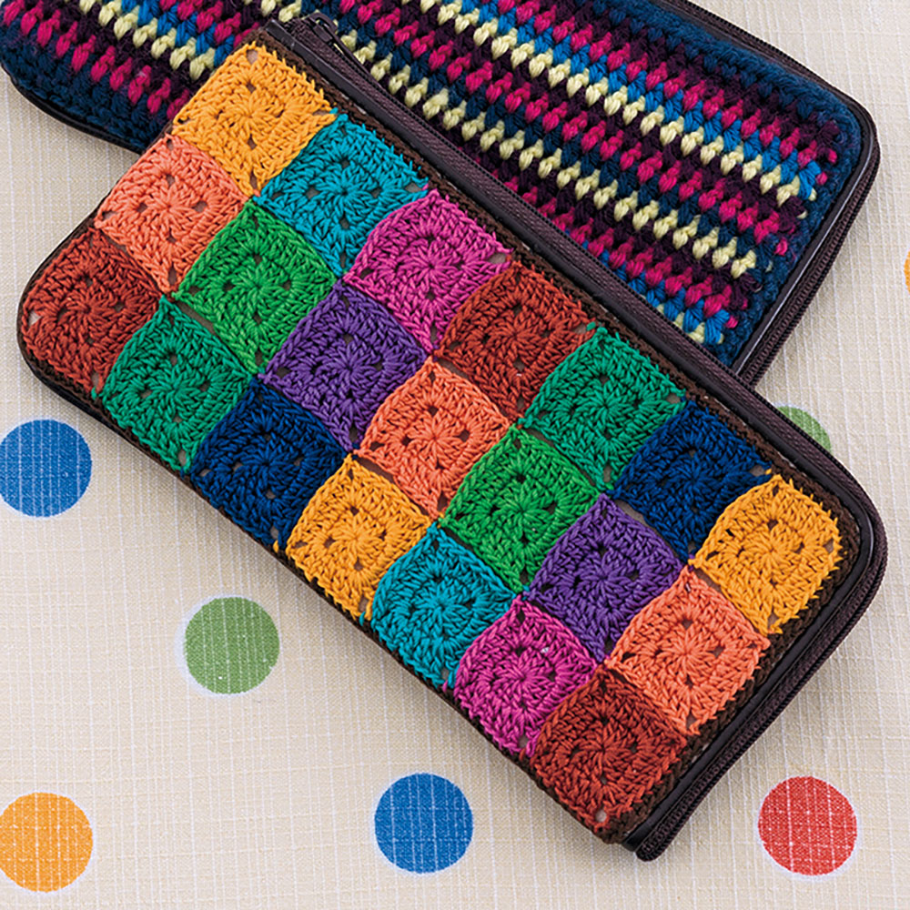材料:オリムパス エミーグランデ〈カラーズ〉 黄(555)、オレンジ色(172)、茶色(755)、紺(355)、紫(675)、ピンク(127)、緑(264)、黄緑(229)、青緑(222)各適宜 エミーグランデ〈ハーブス〉 こげ茶(777)適宜。KAWAGUCHI ウォレット(13-294)1個。