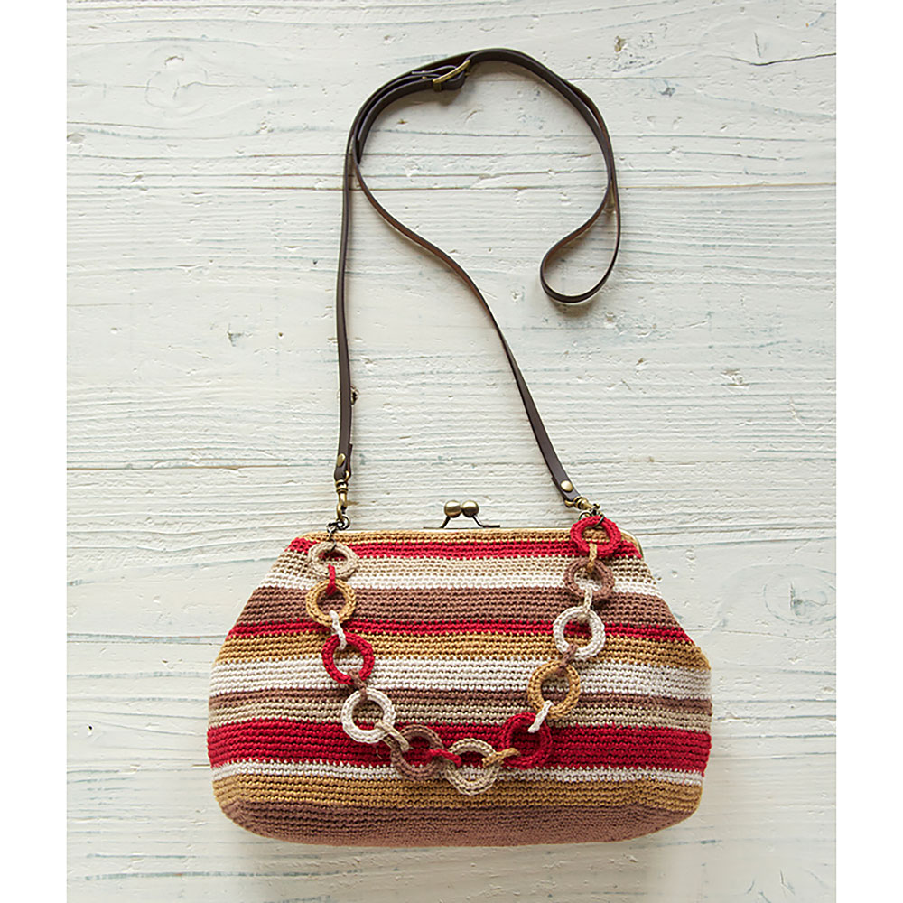 おでかけ気分がぐっとアップするランダムなボーダー柄のハンドバッグ。目の詰まった細編みなので、内袋なしで使えます。リング飾りは取り外してアクセサリーにも。