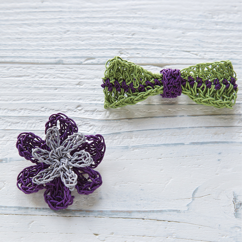 材料:メルヘンアート メルヘンロゼッタコード シルバーグレー(1589)55g、シャンパン(1582)35g、レタスグリーン(1587)36g、グレープ(1586)20g3㎝のブローチピン2個