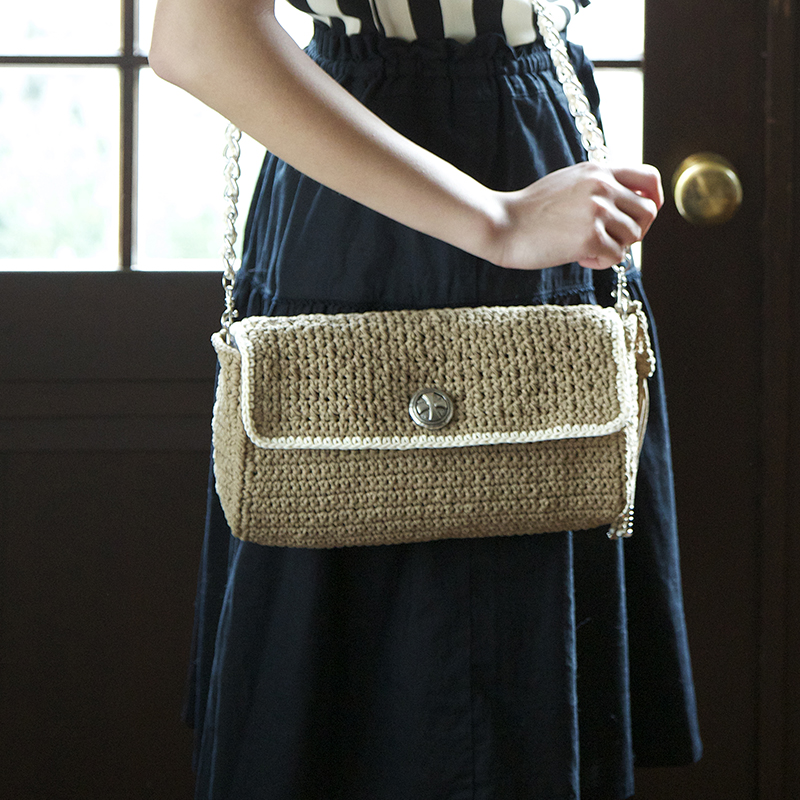 肩ひものチェーンの着脱で2Wayに使えるおしゃれなバッグ。スエード風の糸で高級感を出しました。ベースは細編み、ふただけが模様編みだからとっても簡単。