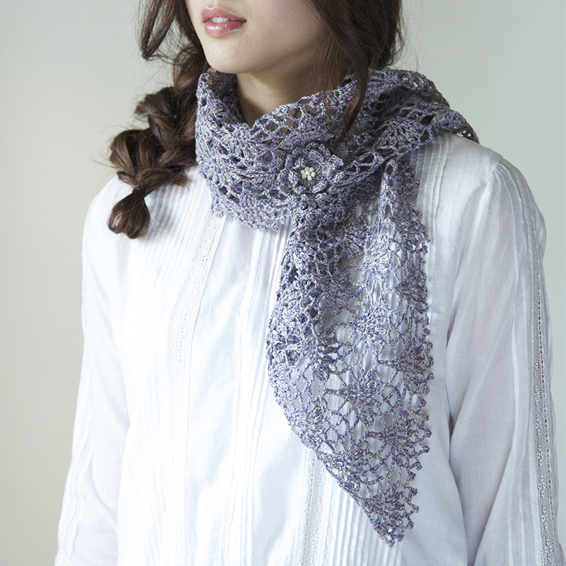 繊細な透かし編みのショールは、クラシックな装いと合わせてレディー風に。扇形の模様を両端で)増やしながら台形に仕上げます。バッグに1枚入れておくと重宝しそう。