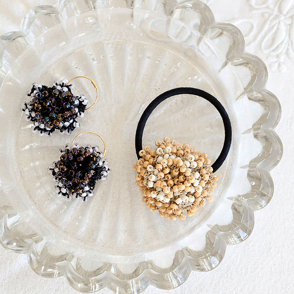 編み方は共通で段数とビーズの色を替えたヘアゴム&ピアス。糸とビーズの配色次第で、雰囲気がさまざまに変わります。