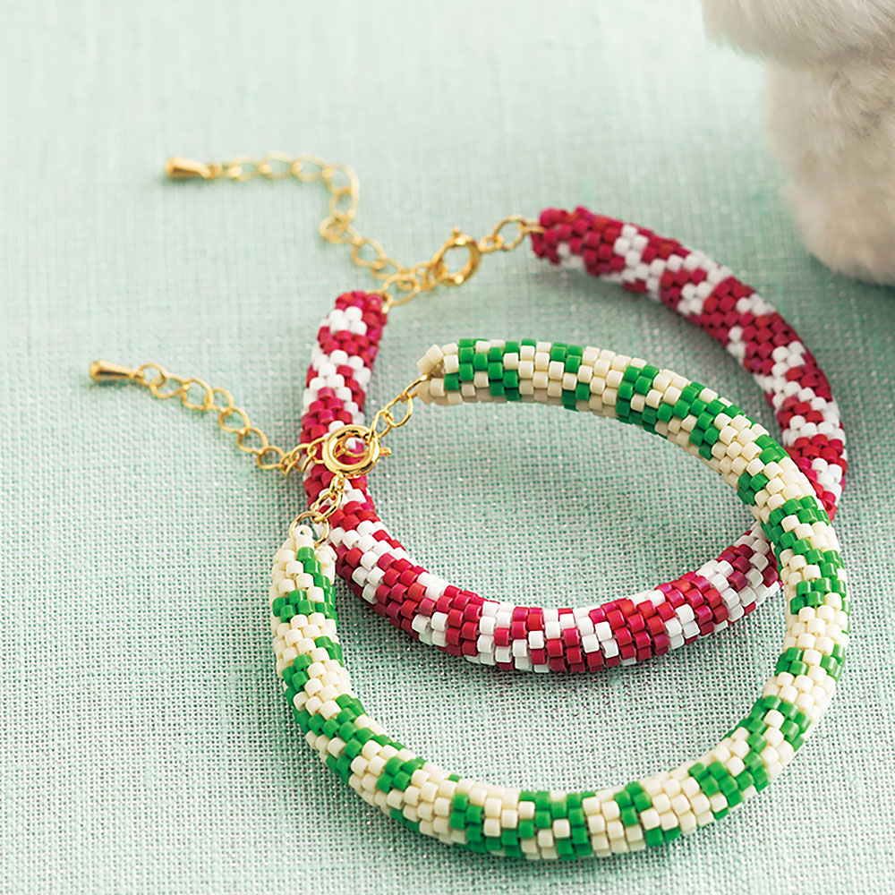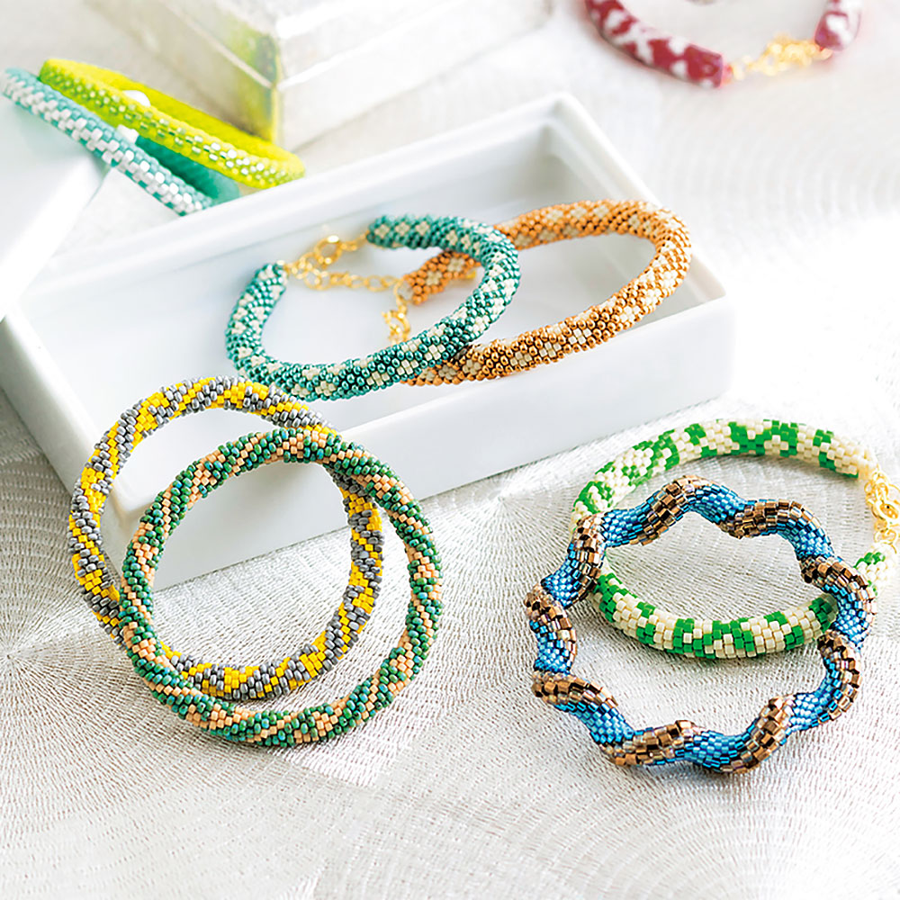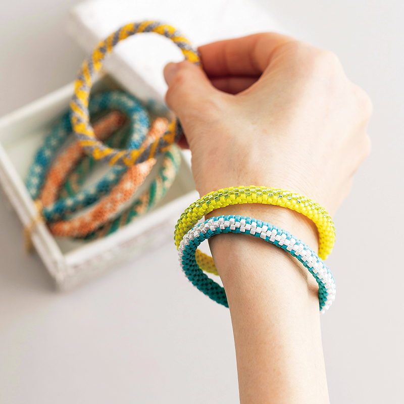 基本の模様は、斜めに走るストライプです。規則正しく通したビーズを編み進むと、自然とねじれてくるのがこの編み方の面白さ。使用するビーズの大きさをあえて大小混合にすることで、ねじれに独特のひねりが加わりました。ねじれの性質を理解すれば、ビーズの配置ひとつで全く異なる表情が楽しめます。