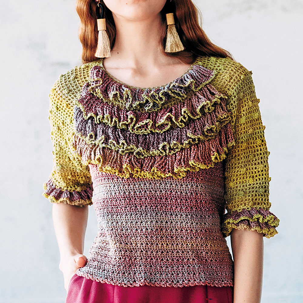 丸ヨークのカーブに添って揺れるフリルの重なりは、手編みならではの醍醐味。このフリル、なんと五つ巻き長編みを編みつけています。たっぷりとしたフリルを身につけると心躍るのは、何歳になっても変わらない乙女心。袖だけに配したパプコーンも可愛らしく、幸せな気持ちで編み進むことができます。