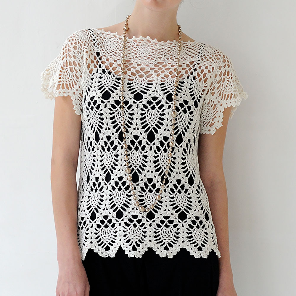 艶やかなシルクコットンコットン素材のプチスリーブプルオーバーは大きなパイナップル模様が印象的。ヨークにはネット編みのレーシーモチーフをつないで、前後身頃を同じに編むやさしいデザイン。