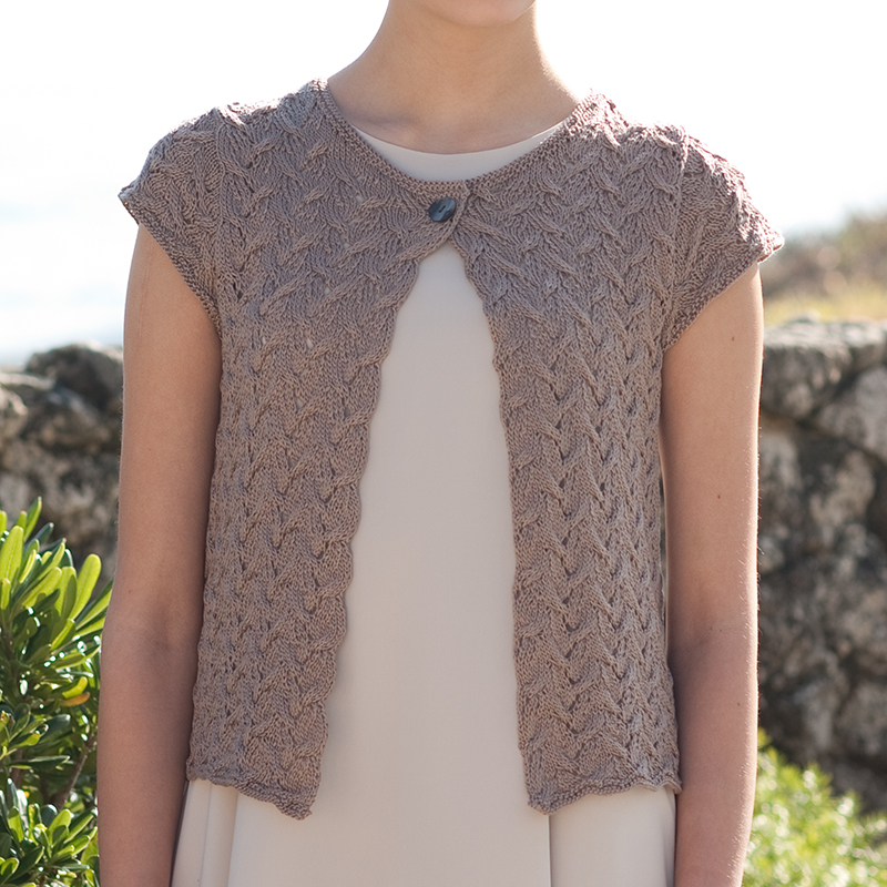 ナチュラルな素材感と色合いが素朴なプチスリーブボレロ。ボリューミーなケーブルも透かし模様を入れて軽く仕上げます。