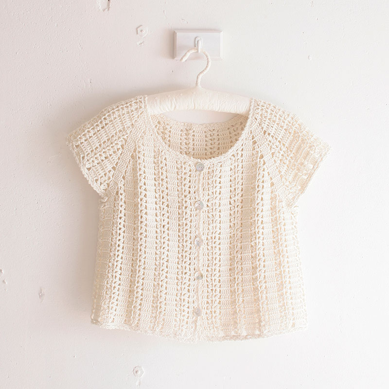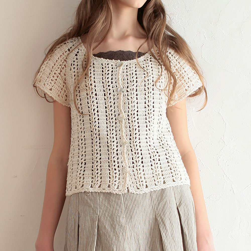 生成り一色のみで仕立てられた、清楚なイメージの半袖のカーディガンです。縦に模様が出るように構成されているのも特徴です。