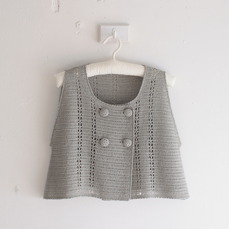 ダブル開き、4つのくるみボタンが印象的なベストです。身頃はゆったりとしたシルエットになっているので気心地も快適です。