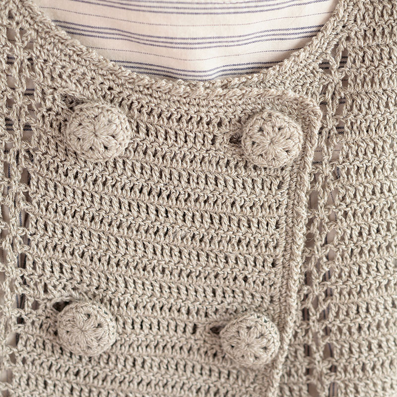材料:ダルマイングス 快適Cafe ラミー麻ブレンド グレー(6)200g=8玉直径2.5cmのボタン(くるみボタン用に薄めの平ボタン)4個、力ボタン4個
