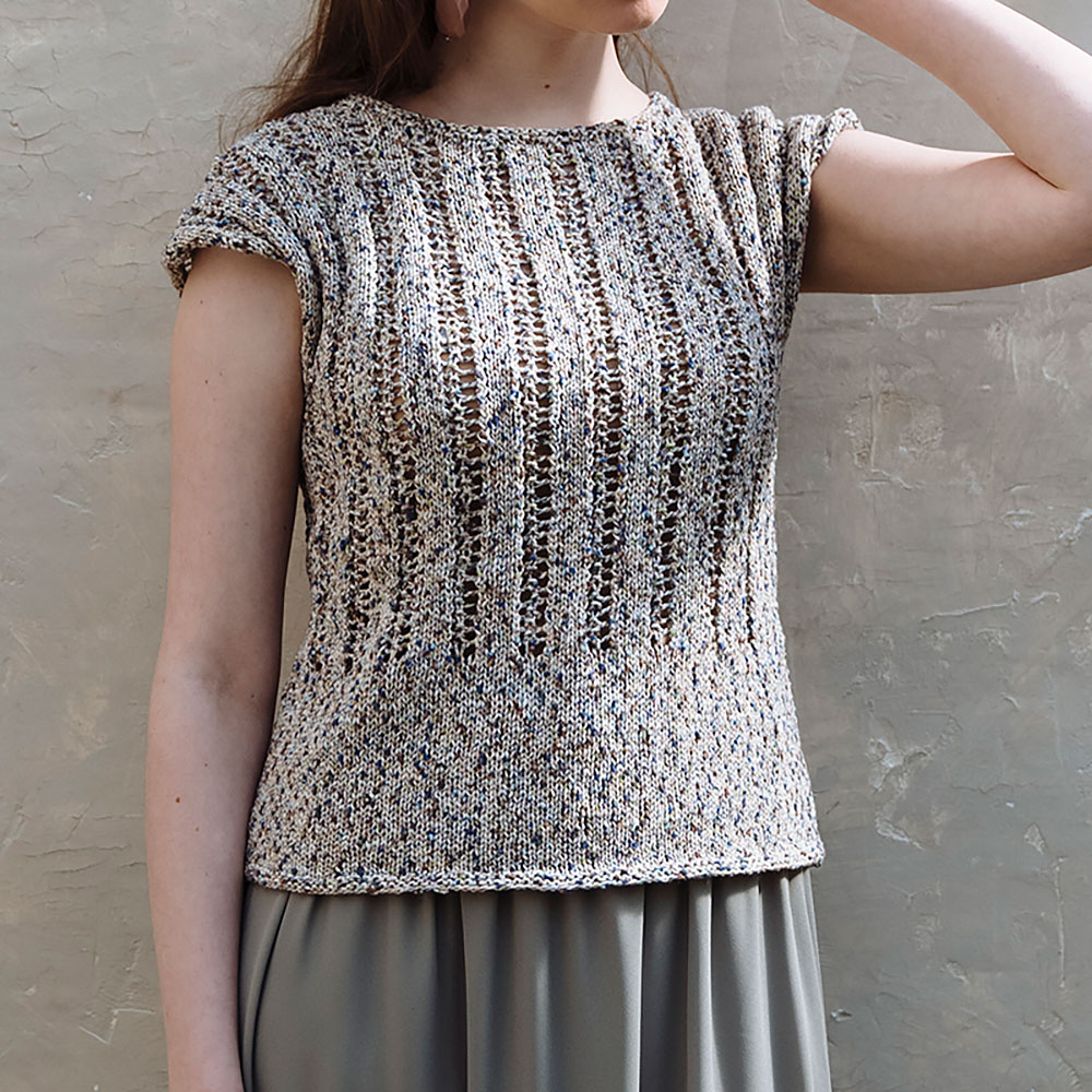 前後同型で編む、やさしいシルエットのフレンチスリーブニット。縦ラインの透かし模様で、程よいフィット感がありつつ、痩せ見え効果も期待できそう。