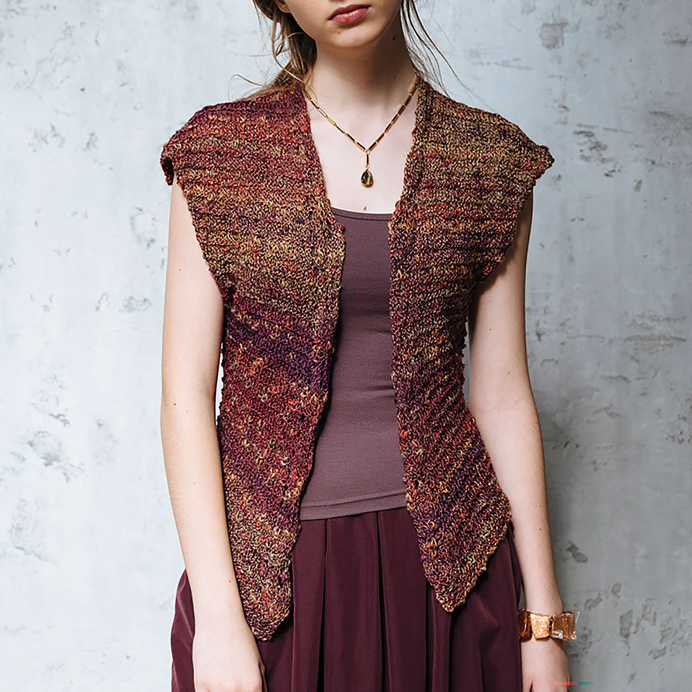 後ろ裾から前へ続けて編む羽織りベストは、前端の木の葉模様がアクセント。かけ目と3目一度、2目一度のマジックで、身頃の裏目ラインが斜めに流れていきます。