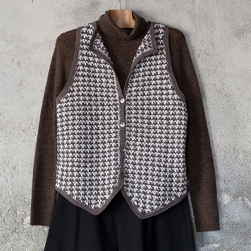 毎段ごとの縞模様が、織り柄のように見えるボーイッシュなベストです。衿の折り返しは裏表のない模様ならではです。