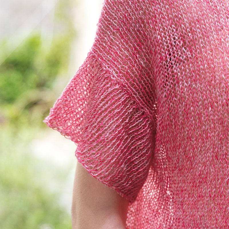仕立ての妙で袖がフリルのように見えて可愛らしい、メリヤス編みの半袖プルオーバー。カットソー感覚で気軽に着られるデザインですが、上品な素材感でカジュアル過ぎず、華やかな雰囲気が漂います。適正号数より少し太い針で、ラフに仕上げるのがポイントです。