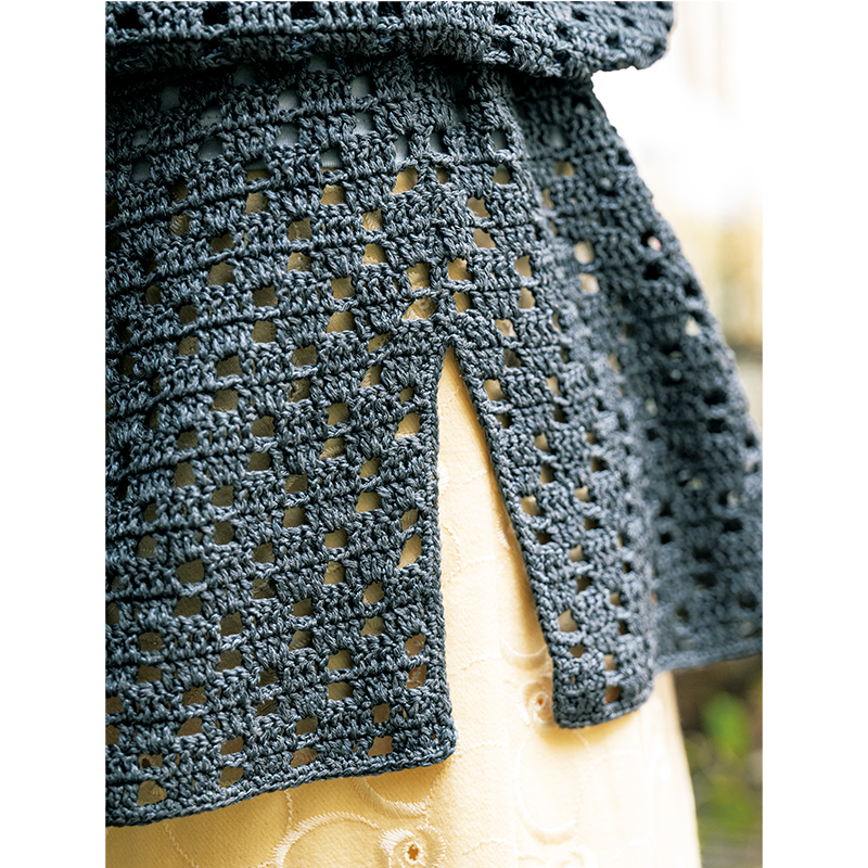 今年のトレンドでもある、ウエストマークタイプのチュニック。細編みで密に編んだパステルトーンのヨーク部分とベースの透け感が対照的で美しく、クロッシェの面白さを感じさせてくれるデザインです。身頃はまっすぐ編んでいるので、脇スリットを入れて着やすく仕上げています。