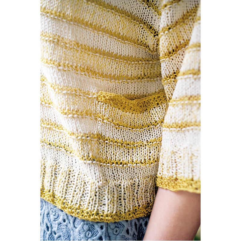 冷房の効いた車内やオフィスでの寒さ対策に、気軽に使えて大活躍! 薄手の七分袖カーディガンは、ナチュラルカラーのボーダー模様。太細2タイプの同色糸と白糸を巧みに組み合わせた配色は、知れば知るほどワクワク。いろいろな色の組み合わせを試してみたくなる配色術です。