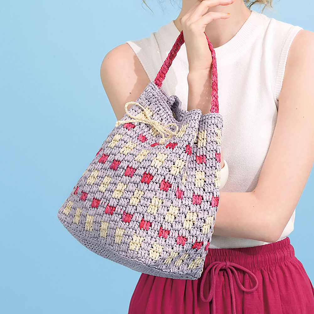素材感のあるペーパーヤーンは、軽い仕上がりと豊富なカラーも魅力。いろいろな色で配色されたブロックがチャーミングなワンハンドルバッグは、中長編みと鎖の単純な模様が段違いになることで、リズミカルな配置が現れます。トレンドの巾着タイプ、底は安定感のある長方形です。