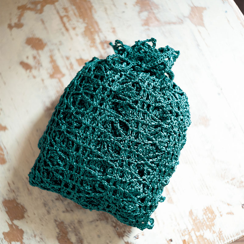 材料:[ショール] パピー イヨワシ 緑(709)155g/7 玉。[ポーチ] パピー イヨワシ 緑(709)20g/1玉。