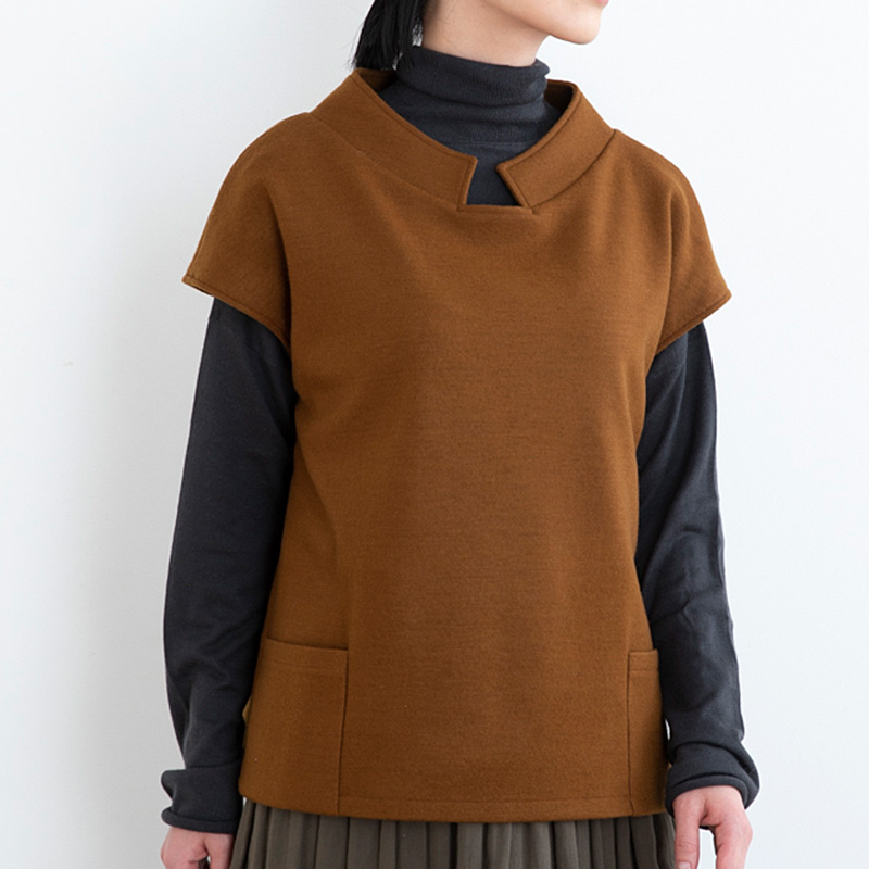 スムースとは、表面が滑らかで、表裏同じ編み方をした布のこと。この布はウール100%の中肉厚ながら、しなやかでハリのあるシルエットが美しく、ストレッチ性があるので、ベストやトップスを作るのに向いています。良質な原料をていねいに加工してあるため、アパレル業界でも人気です。