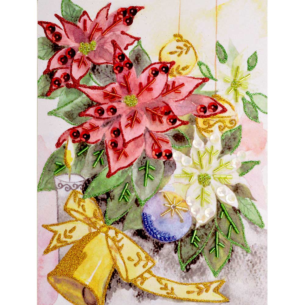 【キット作り方つき】 あらかじめ印刷された下絵の上に、スパンコールなどをデコレーションして仕上げるクラフト。星のようなポインセチアのロマンティックなデザインです。