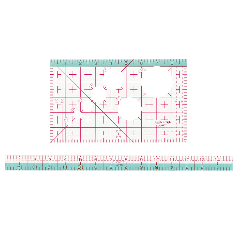 ボタンなどの製図に使える円形の穴が空いたカード型と、縫い代つけに便利な1cm幅の定規2種をセットでお届けします。パッチワークにも役立つ5mm・7mmの目盛りつき。