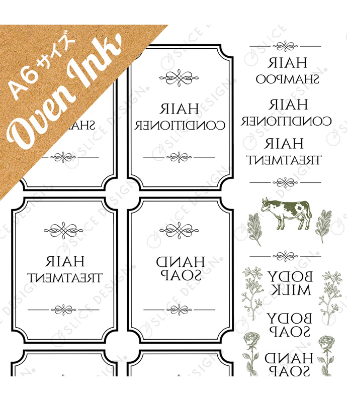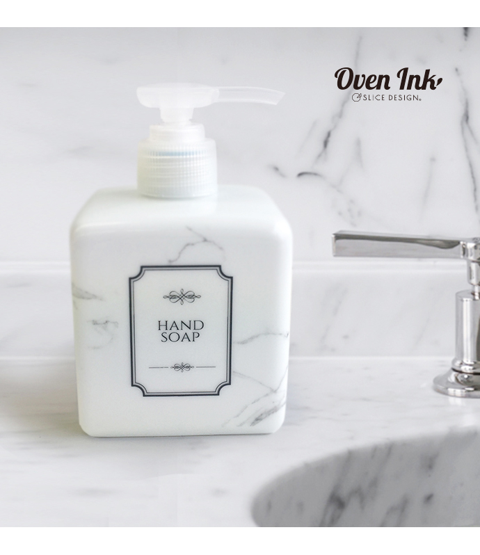 石鹸や洗剤ボトルをオシャレにラベリングできる、クリーンなフォントとフレームが特徴です。
