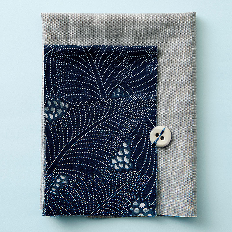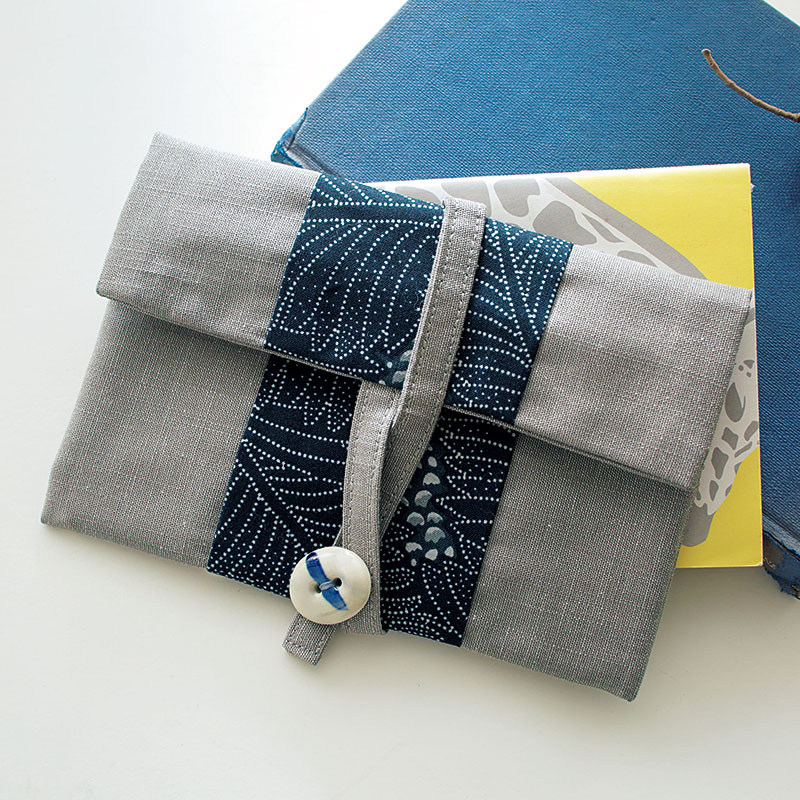 ニュアンスのあるグレーのコットンシャンブレーに、黒羽志寿子オリジナル藍の型染め風のプリント布を組み合わせたカードポーチ。オリジナルデザインの陶製ボタンがポイントになっています。