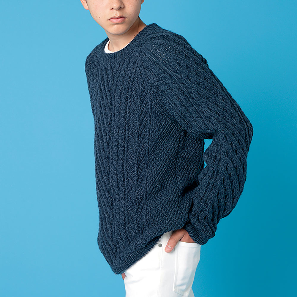 迫力あるバスケット模様の左右には、変わりケーブルと生命の木を並べて。空に向かってすくすくと伸びる模様は、長寿と子孫繁栄の願いが込められています。柔らかな質感の糸は肌触り良く、独特な杢調と落ち感はヴィンテージニットの趣き。グランスリーブの着やすさも魅力です。