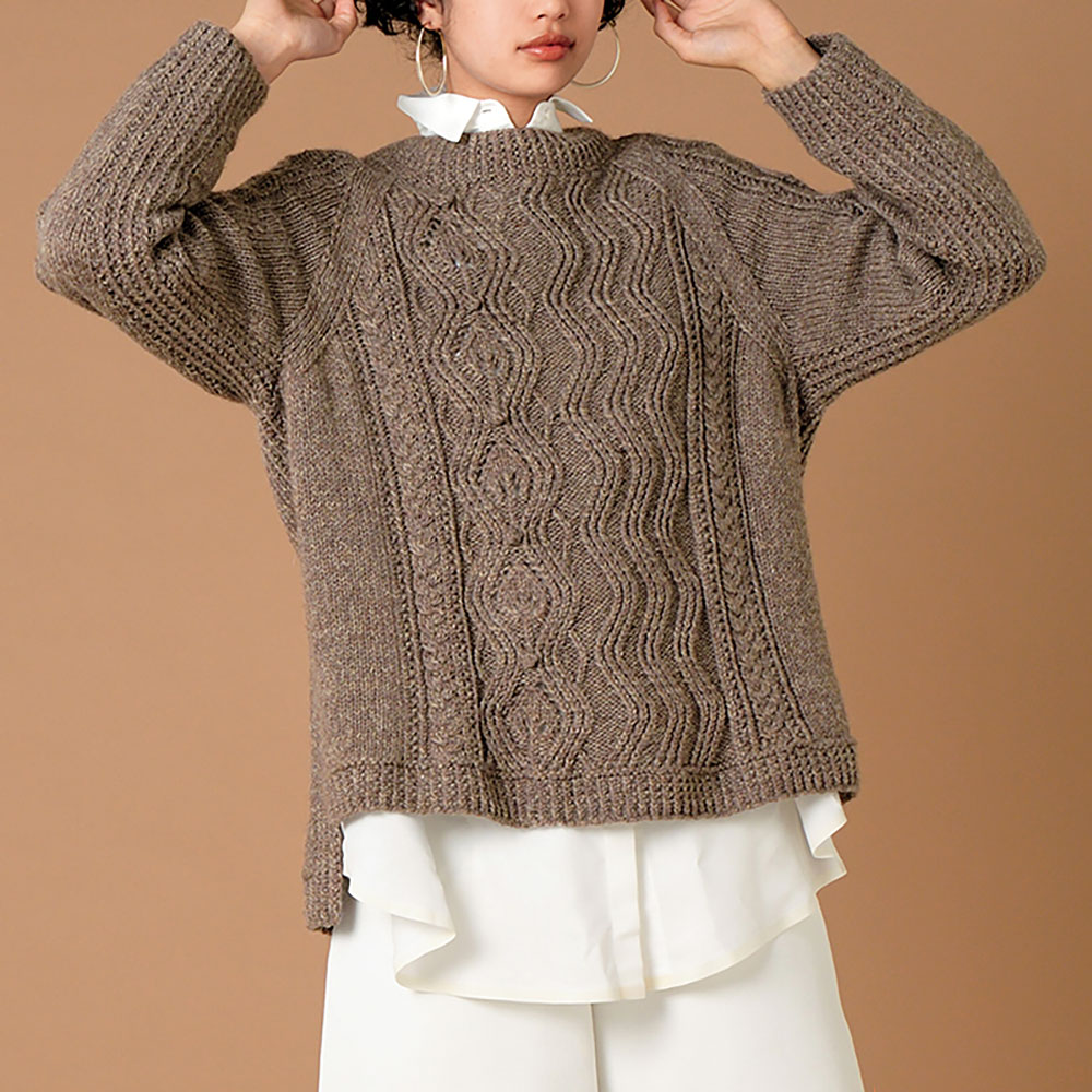 オーバーサイズのラフなシルエットが嬉しいプルオーバー。非対称に配置した、ボッブルの実がついた木の葉を抱くダイヤモンドと、ジグザグ模様を組み合わせたデザインも新鮮です。上部は丸ヨーク状に輪で編んでいるので、ラグラン線の始末は必要ありません。