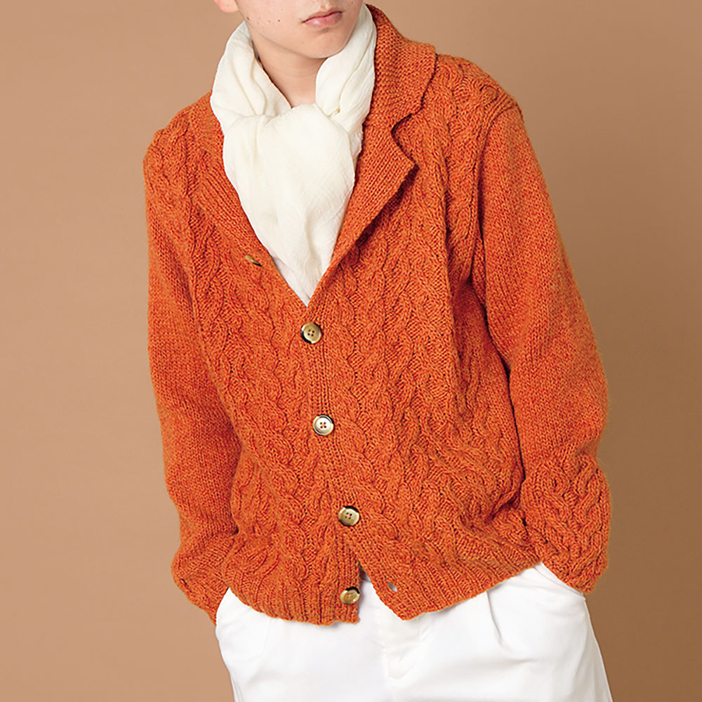 こっくりとした秋色のメンズジャケットは、テーラードカラーできちんとした印象に。たくさんのケーブルをアレンジした、編み応えのあるデザインも素敵です。後ろ身頃と袖はメリヤス編みにし、袖口だけにアクセントを入れています。コートを着てもモコモコしないのは、嬉しい配慮。