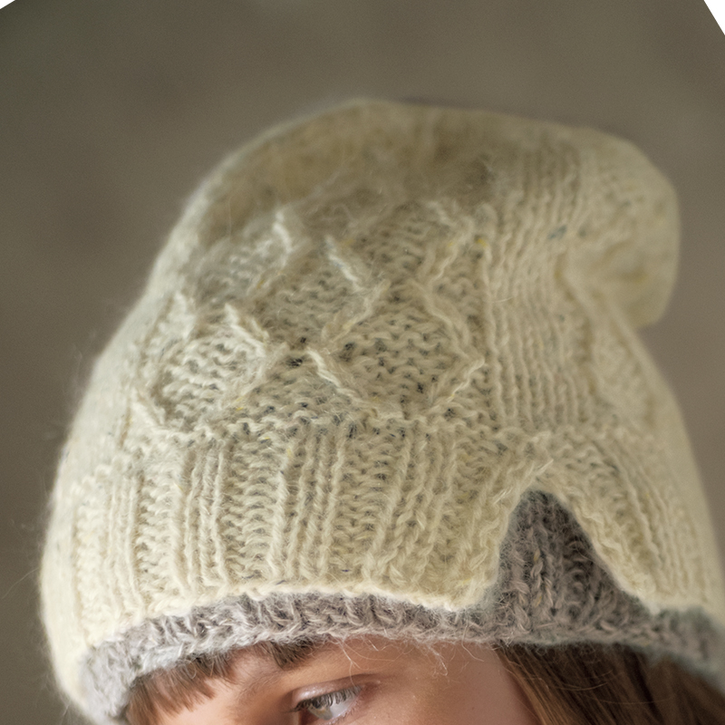 起毛感とさりげないネップがかわいい糸で、プルオーバーと帽子をお揃いに。凝った作りに見えますが、とじはぎがないので余計な心配はいりません。スリット部分で折り返したり、自由に遊べるデザインです。(こちらは帽子のみのレシピです)