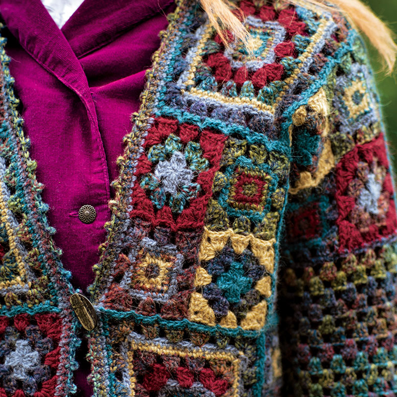 賑やかでいて抑えめの色合いが嬉しい、秋色カーディガン。大小のモチーフをつないだ身頃と、模様編みだけで編んだ袖がベストマッチ! 小モチーフを4枚つなぐと大モチーフの大きさになるので、見た目と違って簡単に、ストレスフリーで編み進められます。