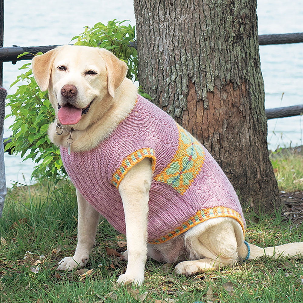 「大型犬のセーターを編みたくても編み図がなくて編めない」との声に応えて、ラブラドールは胸に厚みのある犬種なので、胸の部分は2目ゴム編みで収縮性を出すように考案。ハートが可愛い四つ葉のクローバー模様や色合いが、とても似合っていますね。