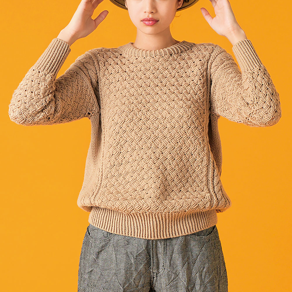 ドライブ編みを交差させて、網代編みのようなバスケット模様に。伝統模様もひとひねりすることで一層魅力が増します。