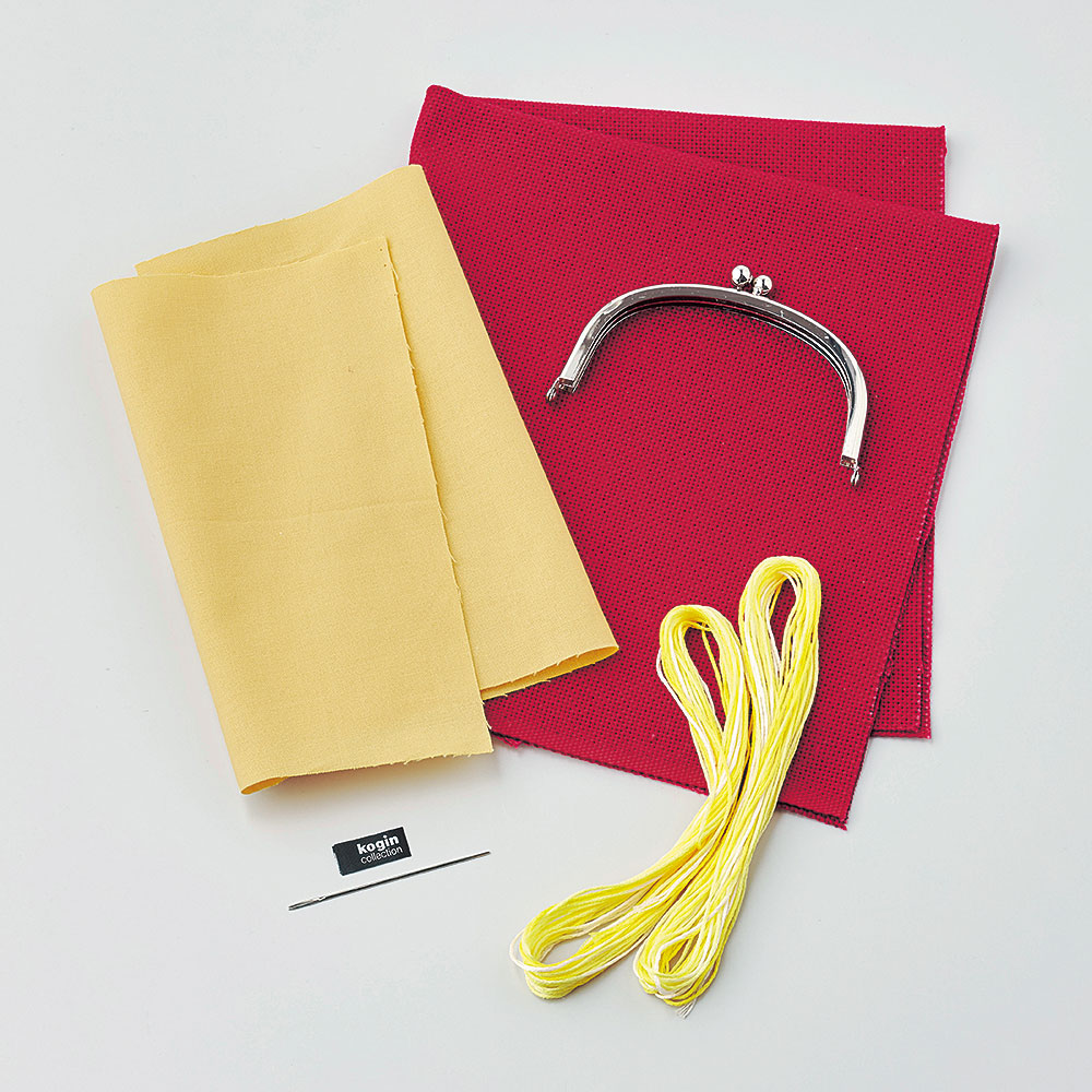 材料セット(刺繍生地、刺繍糸、こぎん刺繍針、金具類など)、作り方説明書など