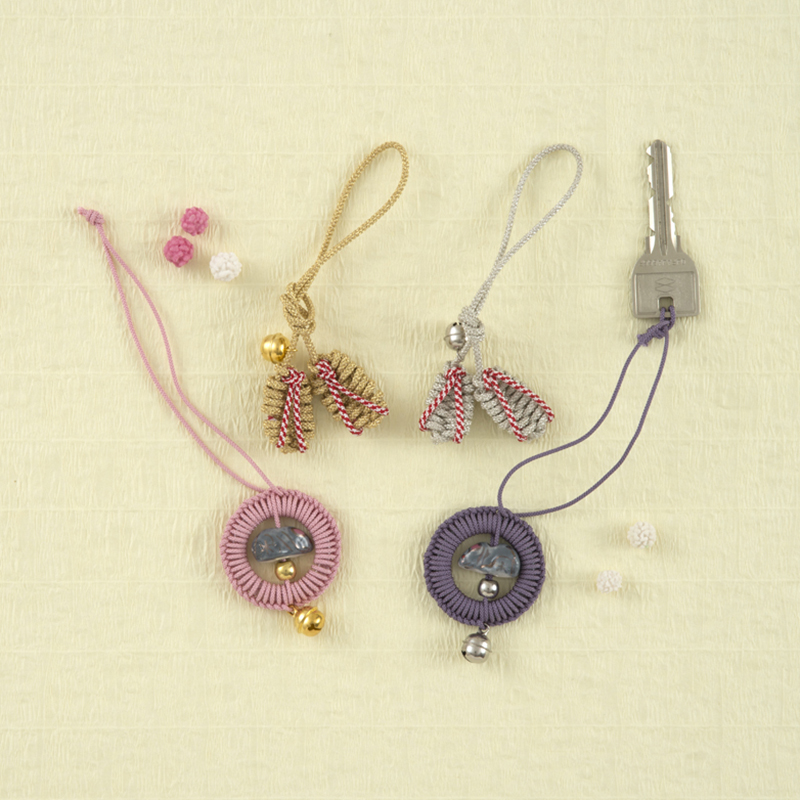 庚子根付=アジアンコード1ミリ、プラリング、陶玉ビーズ、マクラメビーズ、鈴、金銀の健脚来福根付=アジアンコード2・5ミリ、紅白ひも、カン付き宝来鈴
