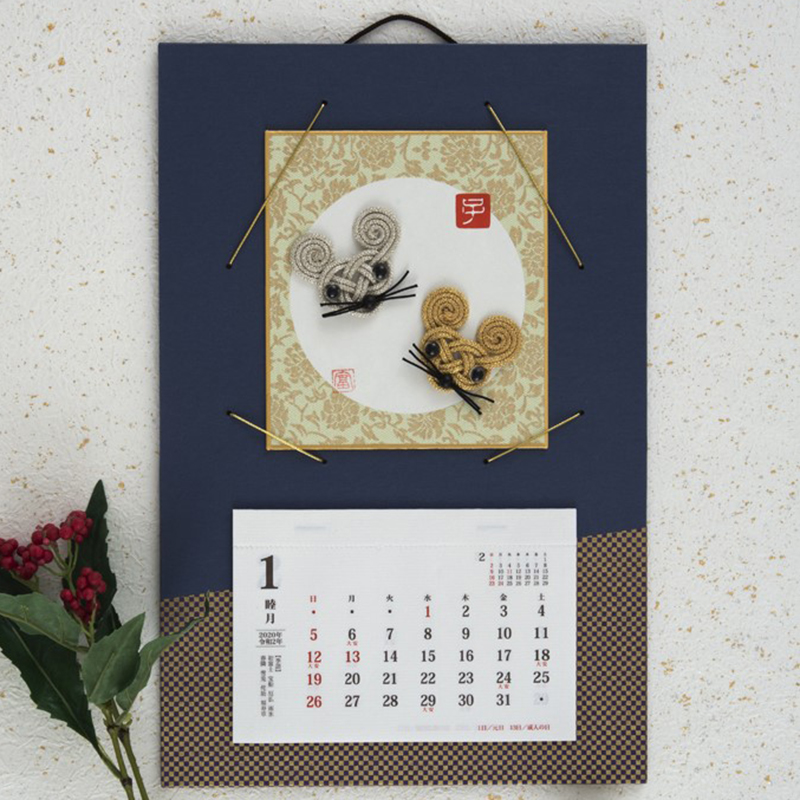 【キット作り方つき】 基本的なあわじ結びだけでできる金銀のネズミを色紙に貼り、品のいい招福カレンダーに。初めての方でも簡単です。