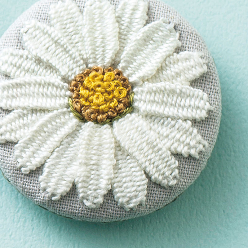 ホワイトデイジーはクラフト感のあるテクニックで仕上げています。デイジーは花の基本と言ってもよく、洋服だけでなくバッグのアクセントとしても。