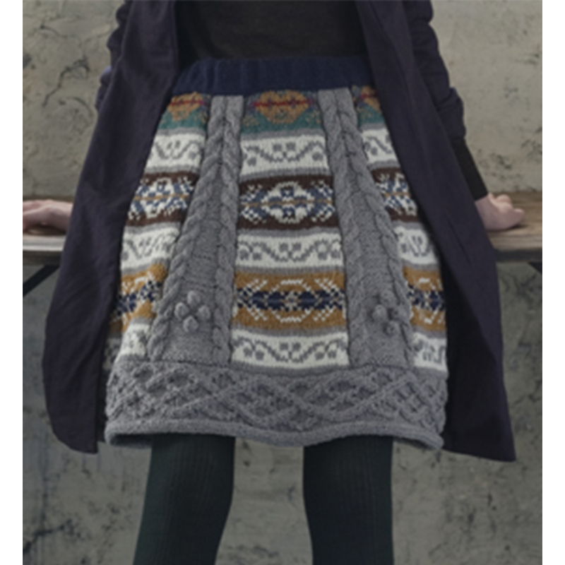 12枚はぎにしたミニスカートは、裾部分にダイヤ柄をぐるりとつけることで、張りのあるバルーンスカートのような雰囲気に。フェアアイル、プラスアランの世界は、民族衣装のような可愛らしい魅力に溢れています。