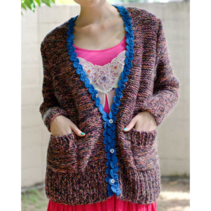 材料:長谷川商店 アンズ HAK1765 ペチュニア(20)195g/8玉。花紬 HKA3857 アプリコット(127)135g/6玉、ベイベリー(144)120g/5玉。シルクツイード HKA1777 ローレル(T-23)120g/5玉、ホットピンク(T-19)90g/4玉。シルクツイード HKA1667 ヴァイオレット(Y-22)120g/5玉。セイカ HK8403Z ボルダ―(7)50g/2玉。ヴィヴィアナ HKA3787 ブルーベル(127)35g/2玉。直径12mmのボタン4個。