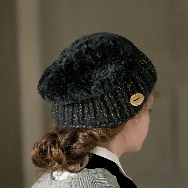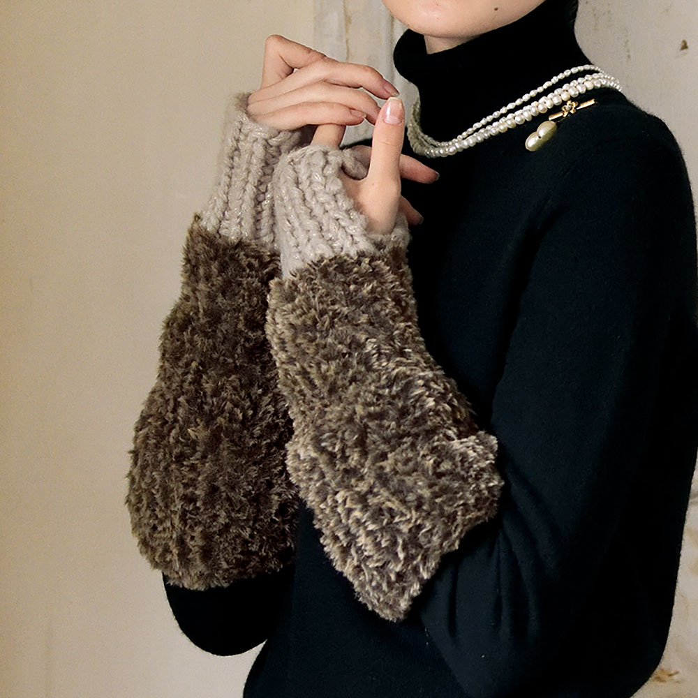 長袖とも、袖なしのウエアとも相性抜群のロングタイプのアームウォーマー。ぬくぬくのファーヤーンに負けない、ボリュームのある極太ヤーンとの組み合わせは、使い勝手も良く、切り替えがアクセントにもなって一石二鳥。指を出す場所を探さずにすみます。かぶり口にはストレートヤーンでゴム編みを編んで、機能性を高めたブラックファーの帽子。ラメ入りの極太ヤーンが品良く輝き、滑らかなファーを引き立てます。糸についてくるゴールドコーティングのボタンをつけると、華やかさがさらにアップ。