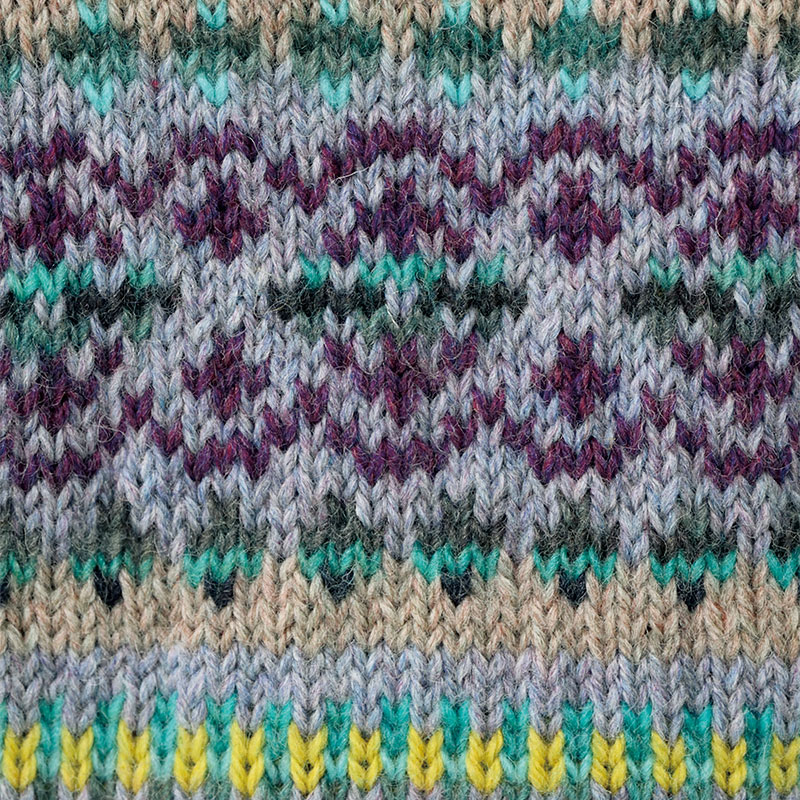 メランジ調の糸を4色と段染めの糸を組み合わせて、もっと多色を編み込みにし たような、複雑なニュアンスを出しています。ラグランスリーブで模様の出方も少し 新鮮に。