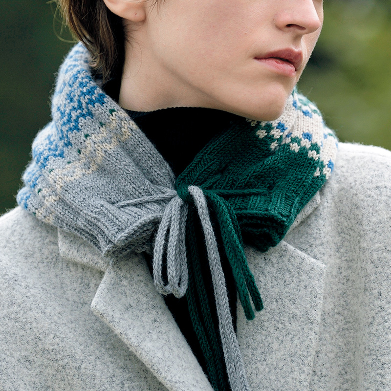 エイトスターをアレンジした編み込み模様とシンプルな柄を組み合わせた、ネックウォーマーにも帽子にもなる4wayニット。細い糸で筒状に柄を変えて編み、両側にひもを通しておくことで、そのままくしゅくしゅとネックウォーマーに、半分を内側に
