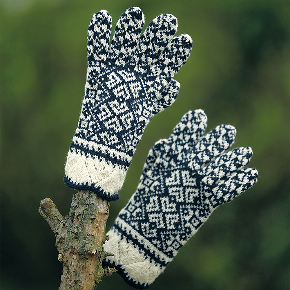 エストニアのキヒヌ島は、「生きた博物館」とも言われる小さな島。そこで出合った模様を組み合わせてみました。透かし模様の入った伝統的なカフスは、少しエレガントな表情を添えてくれます。