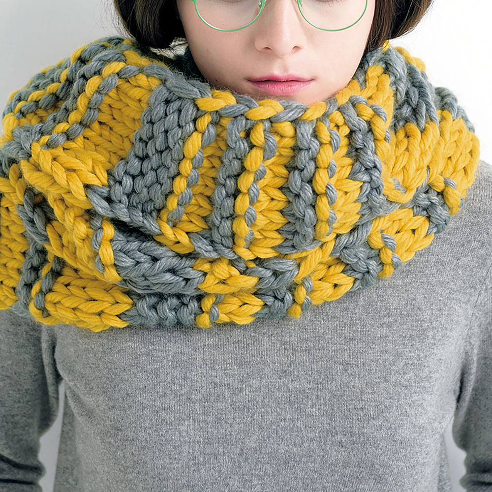 あっという間に編めてしまう、超極太糸の迫力あるスヌードは、思い切った色づかいでコーディネートのスパイスに。スカートとはまた少し違ったアレンジをしてみました。編み目が大きく、パターンの構造もよくわかります。