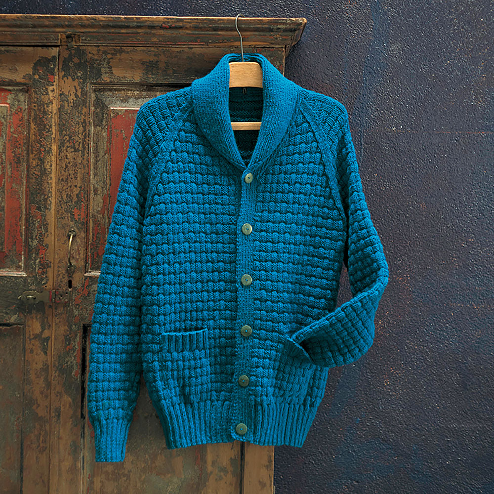 海色ブルーのメンズジャケットは、表目と裏目のブロックが交互に組み合わさって、バスケット編みのよう。同じ目数のくり返しかと思いきや、記号図を見てびっくり。おふたりの関係、勉強になりました。