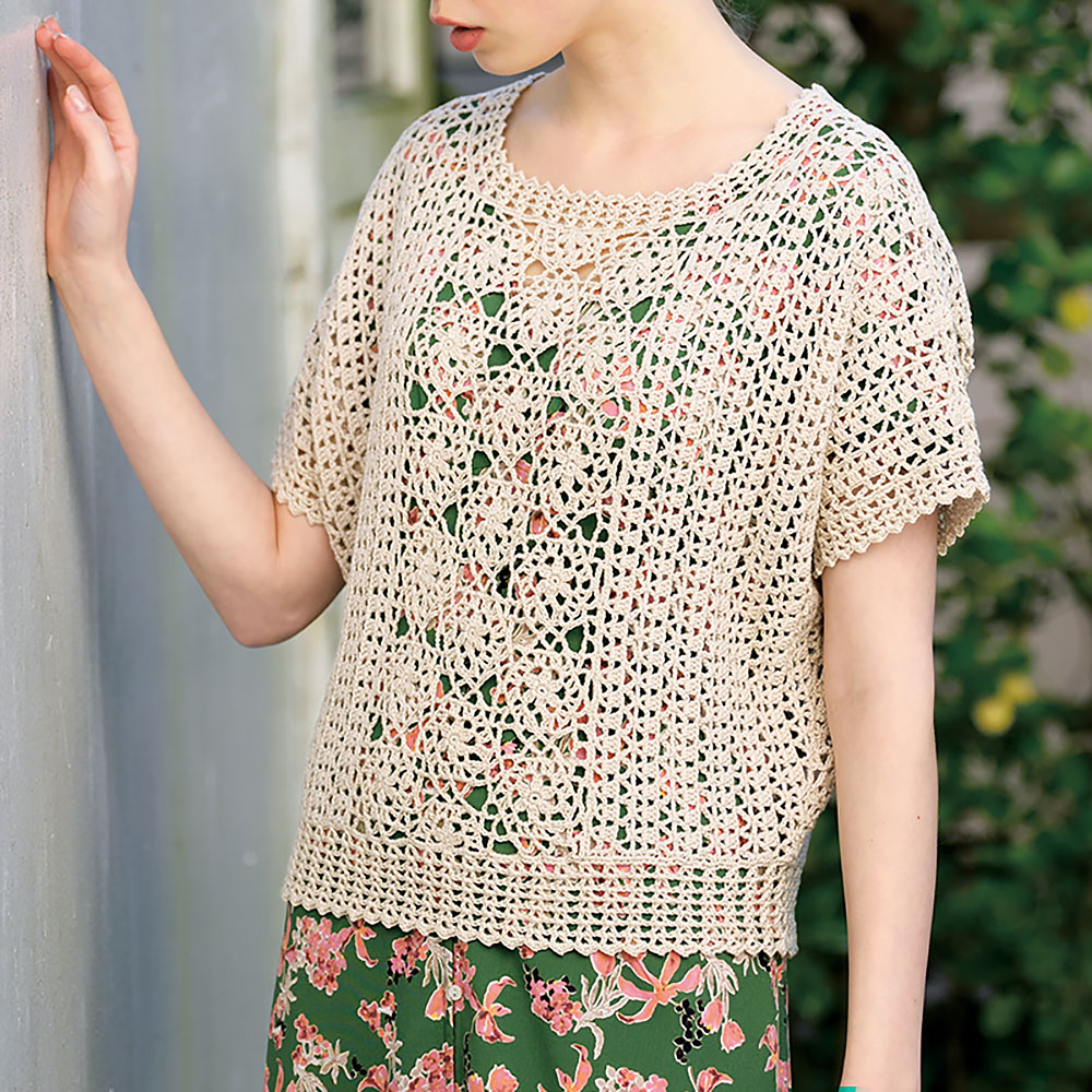 身頃中央に配したのは連続モチーフ。一筆書きのように、糸を切らずにラクラク編むことができます。モチーフから横に編み出したシンプルな地模様と組み合わせて、着やすいフレンチスリーブのプルオーバーに仕上げました。