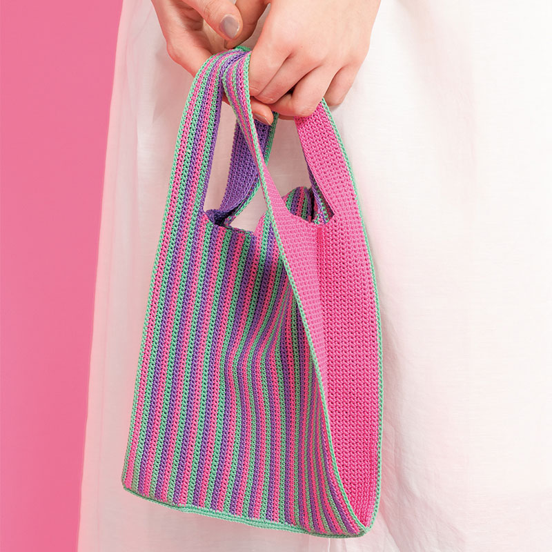 材料:ラガナット ケーブル8 ピンク(6590)・パープル(6591)各35g/ 各1玉、グリーン(7825)25g/1玉。