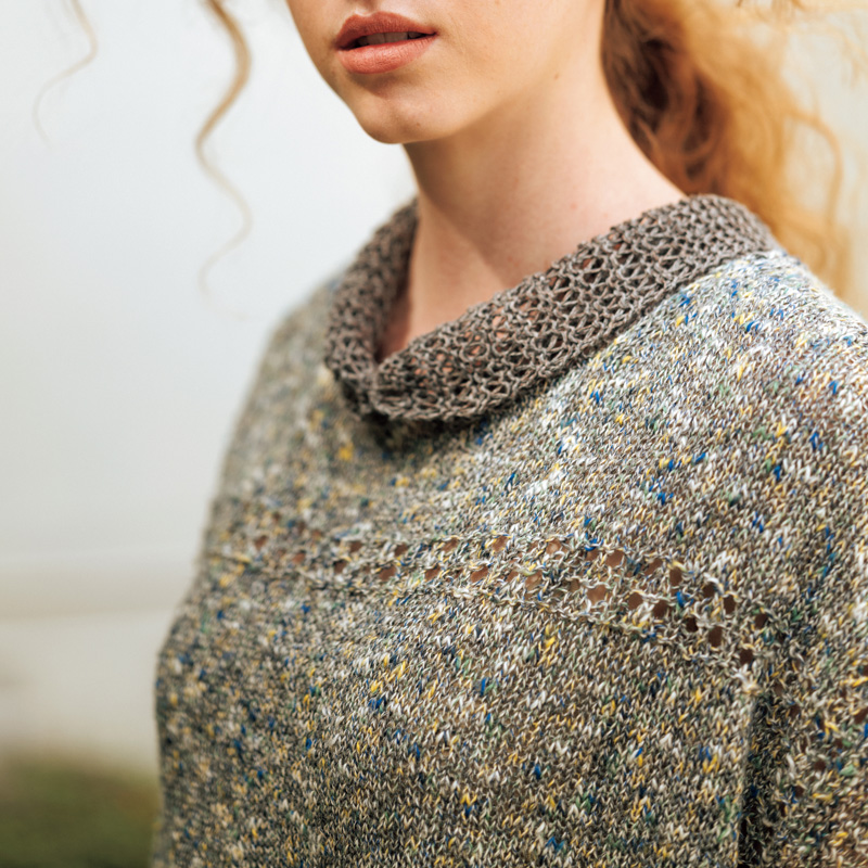 せっかく時間をかけて編むのだから、着回しがきくデザインにチャレンジ! かすり染めの身頃に単色のタイがついたプルオーバーは、タイの結び方だけでなく、前後の衿の形の違いもあって幾通りもの表情が楽しめます。お出かけ前、鏡の前での悩みすぎにご注意を。