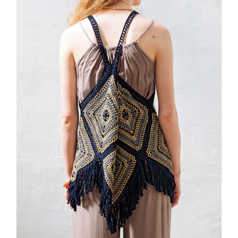 夏の日射しに映える、大きなモチーフをつないだキャミソール。グラニースクエアのような簡単モチーフですが、長編みと細編みの配置や混ざり合う配色が巧みで、おしゃれなアクセサリーウエアになっています。胸元に並んだ小さなモチーフのバランスもナイス!